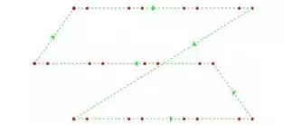 压缩空程时间,可提高机器的效率。如果将次第完成的三个动作,变为“同时”完成,可缩短空程时间:切割头从点A开始向点B移动时,即同时上升;接近点B时,同时下降。如下图所示。