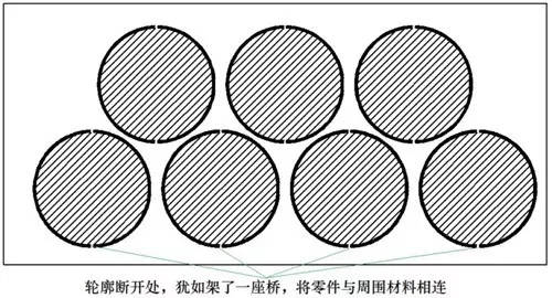 桥位将零件与周围材料连在一起,成熟的编程软件,可根据轮廓的长度,自动加上合适数量的桥位。还能区分内外轮廓,决定是否加桥位,使不留桥位的内轮廓(废料)掉落,而留桥位的外轮廓(零件)与母材粘连在一起,不掉落,从而免去分拣的工作。